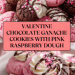 These Valentine Ganache Cookies feature two deliciously distinct doughs—rich chocolate and vibrant pink raspberry—filled with a smooth, luscious ganache center. Perfectly soft and decadent, these cookies are adorned with festive toppings like freeze-dried raspberries, chocolate squares, heart-shaped sprinkles, and a drizzle of melted white chocolate. Ideal for a romantic treat or festive celebration, they combine classic flavors with an elegant presentation.