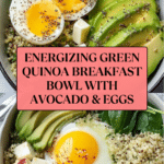 Start your day with this Vibrant Green Quinoa Breakfast Bowl, packed with protein-rich quinoa, nutrient-dense greens, creamy avocado, and soft-boiled eggs for an energizing and wholesome morning meal. This colorful bowl is easy to prepare, customizable with seeds and cheese toppings, and provides a balanced mix of carbohydrates, healthy fats, and protein.
