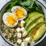 Start your day with this Vibrant Green Quinoa Breakfast Bowl, packed with protein-rich quinoa, nutrient-dense greens, creamy avocado, and soft-boiled eggs for an energizing and wholesome morning meal. This colorful bowl is easy to prepare, customizable with seeds and cheese toppings, and provides a balanced mix of carbohydrates, healthy fats, and protein.