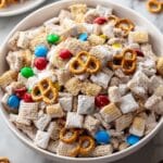 - Combine Dry Ingredients: In a large mixing bowl, gently mix together Rice Chex, Corn Chex, Honey Nut Cheerios, mini pretzels, plain M&Ms, peanut M&Ms, and salted peanuts until evenly distributed.